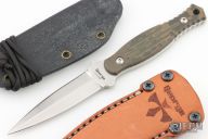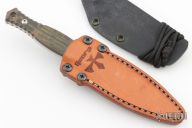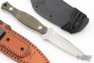 This Galvo Dagger by Les George features a hand rub satin finished double-edged blade with .176" blade stock and .917" blade depth, full tang construction. The handle has DigiCam G-10 scales and a lanyard hole. Comes with a kydex sheath with paracord, and leather sheath. Has some light scuffs, and spots on the blade. Appears to be resharpened. Great condition otherwise.