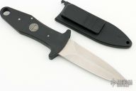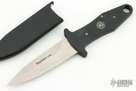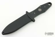 This knife is a Blackie Collins Design. Features a satin finished double edged blade with .180" blade stock and 1.126" blade depth, hidden tang construction with black FRN handle. Comes with original sheath. Has some light scuffs and scratches, excellent condition otherwise.