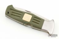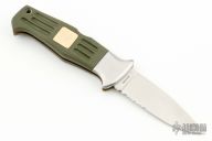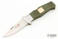 This AL MAR SERE Tactical Folding Knife features a satin finished spear point blade with a partially serrated edge. The handle has stainless steel bolsters, textured green Neoprene with the RARE and limited GOLD Al Mar Chop inlaid on both sides, brass liners, stainless steel spring and backspacer, lanyard hole. Made in the 1980s. Comes with a black nylon sheath. Has some light scuffs and scratches, otherwise excellent condition.