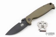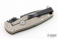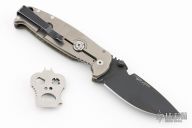 This DPx HEST/F 2.0 features a black PVD coated drop point blade with serrations, dual thumb studs and notch that doubles as a bottle opener. The notched thumb rest pulls pulls double duty with three different sized wire strippers. The handle is comprised of an OD green G10 "A" side and a tumbled titanium lockside with "RotoBlock" mechanism that turns the knife into a virtual fixed blade with a turn of the dial. Black polymer backspacer. The stainless steel tip up clip can be positioned for left or right hand carry. Carbide glass breaker on pommel can be replaced with a rounded screw (included) if desired. Lanyard hole doubles as a 1/4" hex driver. Comes with Skull Tool. Comes with original box and papers, has some light scuffs, otherwise excellent condition.