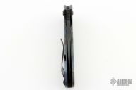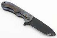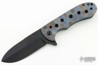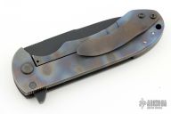 This Framelock Flipper by Michael Burch features a black blade with a notched thumbrest and flipper. The handle has a flame anodized titanium frame over a G-10 backspacer. Flame anodized titanium tip up clip. Nice detent, lockup and blade seating.  Includes a padded zippered case.  There is some separation inbetween the backspacer and the frame. Has some scuffs, otherwise good condition.
