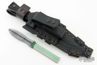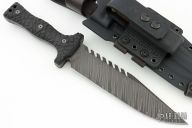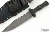 This Custom M-22 by Miller Bros Blades features a clip point blade with sawteeth on the spine made from Z-Wear PM steel, .321" blade stock 1.959" blade depth, full tang construction. The handle has black G-10 scales, lanyard holes at the butt. Comes with a kydex/leather sheath and COA dated 1-2024. New condition.