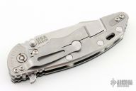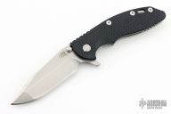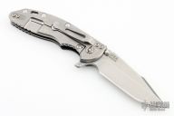 This XM-18 by Rick Hinderer features a stonewash finished blade with notched thumbrest and flipper. The handle has a black G-10 scale, stonewashed titanium frame, and a tip up or down reversible flamed titanium clip and copper filler tab, lanyard hole at the butt. Comes with original box and extra hardware. New condition.