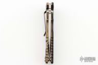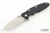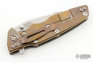 This Eklipse Tri-Way by Hinderer Knives features a stonewashed harpoon tanto blade with dual thumbstuds, flipper and notched thumbrest. The handle has a stonewashed bronze titanium frame and liner with a textured G-10 scale and tumbled titanium clip and hardware. Nice detent, lockup and blade seating. Comes with original box, card and extra hardware. New condition.