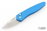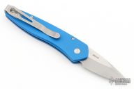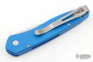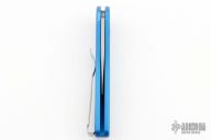 This Half Breed by Pro-Tech has a stonewashed blade with swedge. The handle has a blue aluminum frame with a stainless tip up steel pocket clip. #119PR5. Includes original box and papers. Has some dings in the frame and a couple light scratches, great condition otherwise.