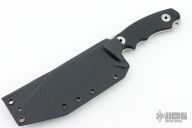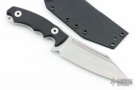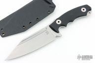 This Assaucalypse Compact by Bastinelli Knives features a stonewash finished blade with fullers and notched thumbrest, .146" blade stock and 1.699" blade depth, full tang construction with black G-10 scales. Comes with a kydex sheath and original box. Has some light scratches and staining on the blade, otherwise good condition.