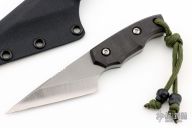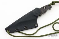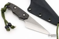 This knife by C&C (please let us know if you know who this is) features a two-tone blade with notched thumbrest, .250" blade stock and 1.111" blade depth, full tang construction. The handle has carbon fiber scales. Comes with a kydex sheath.  The tip is missing. Has some scratches, otherwise excellent condition.