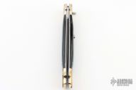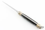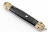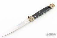 This Auto by Agasi Hambartsumian of Armenian Doctor Knives features a mirror polished blade. The handle has engraved brass bolsters, stainless steel liners, buffalo horn scales with stainless steel pins, fileworked stainless steel backspacer. New from maker. Has some patina on the bolsters