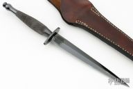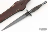 This Fairbairn Sykes Fighting Knife by Peter Parkinson features a double-edged blued blade, .243" blade stock and .956" blade depth, hidden tang construction. The handle has a blued steel guard and knurled handle. Comes with a brown leather sheath. Has some scratches and has been resharpened, otherwise good condition.