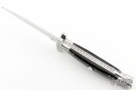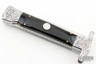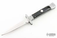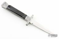 This Auto by Agasi Hambartsumian of Armenian Doctor Knives features a satin polished blade. The handle has engraved stainless steel bolsters, stainless steel liners, buffalo horn scales with brass pins, fileworked stainless steel backspacer. New from maker. Has some oxidation on the bolsters.