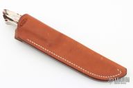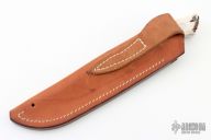 The 5" Utility by Bob Loveless features a mirror finished clip point blade with the "R.W. Loveless maker Riverside CA" Double Nude logo. Full tapered tang construction. .204" Blade Stock .980" Blade Depth. The handle has a stainless steel guard and stag scales with red liners, lanyard hole. #801. Comes with matching numbered leather sheath. Excellent condition. Comes with a zippered case.