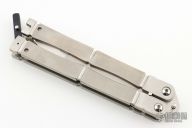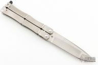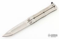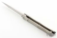 This Prototype Balisong by Reese Weiland has a hand rub satin finished blade with textured flats. The handles are lightly orange peeled titanium with bamboo style milling and a black G-10 T-Latch. Includes a padded zippered case. New from maker.
