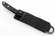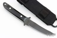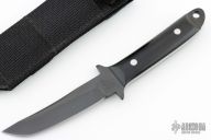 This tanto by Dawson has a black coated blade with full tang construction, .202" blade stock and .905" blade depth. The handle has black linen micarta scales. Comes with a black nylon sheath. Excellent condition. #46