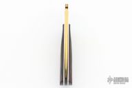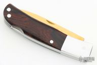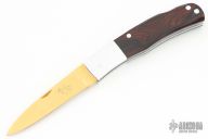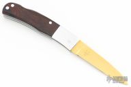 This lockback by Ed Lane features a gold coated blade with nail nick. The handle has dovetailed aluminum bolsters with integral liners, cocobolo scales, stainless steel lockbar, black canvas micarta backspacer. Has some light scratches, otherwise excellent condition. Blade is marked "K-3 008T 90"