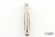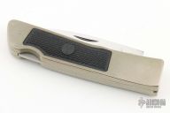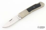 This Loveless Design lockback by Gerber Knives has a polished drop point blade with a nail nick. Has "Design by R.W. Loveless" etched on the blade.  The handle has a nickel silver frame with rubber inserts. Comes with Gerber nylon sheath. Has a few light scratches, otherwise excellent condition.