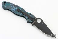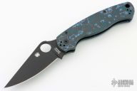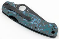 This Paramilitary 2 Linerlock Folder from Spyderco has a black finished clip point blade with thumb hole and notched thumb rest. Handle has black/blue Fat Carbon scales with stainless steel liners and stainless steel 4-way reversible clip. Comes with original box and papers. Has a couple light scuffs, otherwise excellent condition.