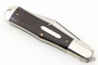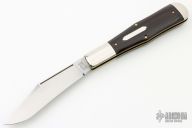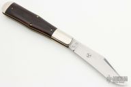 This knife features a satin finished clip point blade with a single nail nick.  The handle features nickel silver bolsters, maroon linen micarta covers and brass liners.  Flush half-stop.  Includes the original tube, button and paper.  Has some patina, light scuffs, otherwise Excellent Condition.