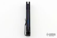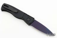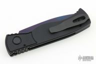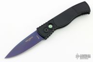 This is a TR-2 side opening auto by Pro-Tech Knives with a sapphire blue blade. It has a black aluminum handle with abalone push button, black deep carry stainless steel clip. Coil spring. Comes with original box and papers. New from maker.