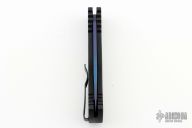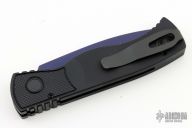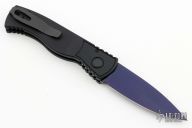 This is a TR-2 side opening auto by Pro-Tech Knives with a sapphire blue blade. It has a black aluminum handle with abalone push button, black deep carry stainless steel clip. Coil spring. Comes with original box and papers. New from maker.