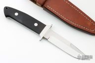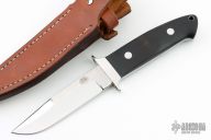 This Loveless Style Chute by Wesley Liversage features a mirror finished blade with sharpened top edge, .201" blade stock and 1.057" blade depth, full tapered tang construction. The handle has stainless steel guard, Chacate Preto wood scales with silver formica and black liners and stainless steel pins. Comes with a brown leather sheath and a zippered case. Has a few light scratches, otherwise excellent condition. Comes with COA dated 4/10/23