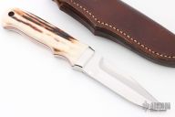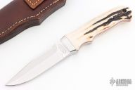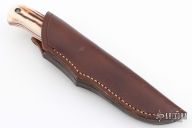 This Loveless Style New York Special by Shaun Bruwer features a mirror finished blade with sharpened top edge, .180" blade stock and .956" blade depth, full tapered tang construction. The handle has stainless steel guard, stag scales with red liners and hidden pins. Comes with a brown leather sheath and a zippered case. Comes with a COA dated 7-24-23. Has a few light scratches, otherwise excellent condition.