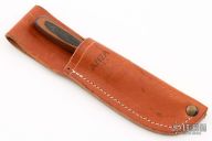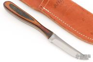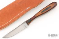 This small file knife by Anza Knives features a blade made from a file, dymondwood scales, .093" blade thickness and .497" blade depth, full tang construction. Comes with a brown leather sheath. Excellent Condition.