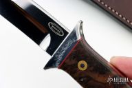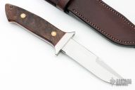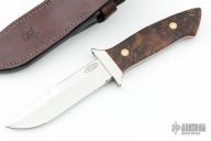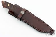 This Loveless Style Chute by Shaun Bruwer features a mirror finished blade with sharpened top edge, .198" blade stock and 1.071" blade depth, full tapered tang construction. The handle has stainless steel guard, burl wood scales with red liners and stainless steel/brass Loveless pins. Comes with a brown leather sheath and a zippered case. Has a few scratches on the guard, otherwise excellent condition.