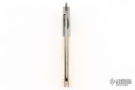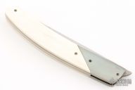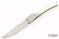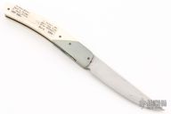 This front flipping linerlock by John Wilmot features a Damascus blade with notched front flipper. The handle has titanium bolsters, warthog tusk scales, anodized titanium liners and a steel backspacer. Nice detent, lockup and blade seating.  Light scuffs/scratches otherwise the knife is in good condition.