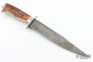 This Fighter by Gary Mulkey has an Explosion Pattern Damascus blade with false top edge, .249" blade stock and 1.359" blade depth, hidden/frame tang construction. The handle has a stainless steel guard and butt, mammoth ivory scales, stainless steel frame. Comes with a zippered case and makers card. New from maker.