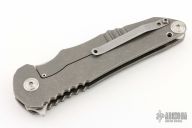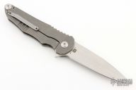 This Urban Dagger from Mikkel Willumsen features a chisel ground dagger style satin finished blade with a partially sharpened top edge and compound grinds. The handle is comprised of a tumble finished titanium with black G10 inlay on the presentation side. Stonewashed titanium tip up clip, aluminum standoff and lanyard hole in pommel. Great blade seating, detent and lock up. Knife flips well on IKBS. Comes with original box and papers. Excellent condition.