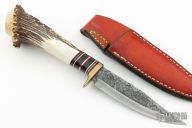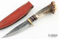 This sheath knife by Shosui Takeda features an Aogami Super Steel (AS) blade, .142" blade stock and .988" blade depth, hidden tang construction. The handle has brass guard, crown stag grip with black/brass/red/white/nickel silver spacers. Comes with a brown leather sheath. Excellent condition.