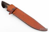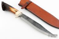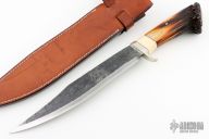 This Bowie by Shosui Takeda features an Aogami Super Steel (AS) blade, .241" blade stock and 1.791" blade depth, hidden tang construction. The handle has nickel silver guard, crown stag grip with black and walrus ivory spacers. Comes with a brown leather sheath. Has a little patina, otherwise excellent condition.
