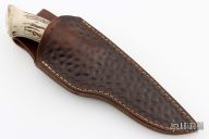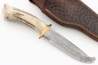 This knife by Master Smith Murray Carter features a Damascus clad San Mai blade with a false top edge, .202" blade thickness and 1.185" blade depth, hidden tang construction. The handle has a brass guard and a crown stag grip with a mosaic pin. Comes with hand tooled brown leather sheath. Excellent Condition.