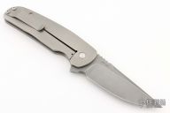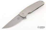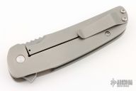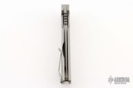 This Logic framelock flipper by Dustin Turpin features a bead blast and tumble finished blade with swedge, notched thumb rest and flipper. The handle is comprised of tumble finished titanium over barrel spacers. Matching titanium tip up pocket clip. Has scuffs and scratches, good condition otherwise.