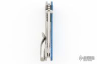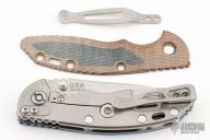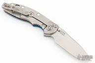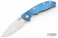 This 3" XM-18 Slicer by Rick Hinderer Knives features a stonewash finished drop point blade with swedge, dual thumb studs and notched thumb rest. The handle is comprised of a custom blue linen micarta scale over titanium liner on the "A" side and a stonewashed titanium lockside, custom deep carry pocket clip, has lockbar stabilizer and pivot. Has been resharpened, otherwise excellent condition. Comes with original box and extra hardware. Comes with an additional custom scale and original clip.