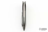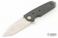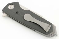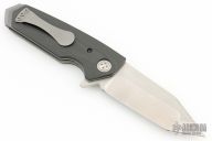 This prototype flipper features a satin finished clip point tanto blade with a flipper. The handle has G-10 scales, anodized titanium liners, stainless steel back-spacer and pommel, and a bead blast stainless steel clip, tip up carry. Has some light scuffs and scratches otherwise excellent condition.