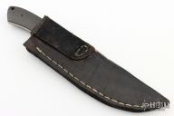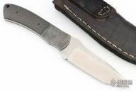 This Knife by Aaron Frederick features a satin finished blade with .161" blade stock and 1.151" blade depth, full tang construction. The handle has Damascus bolsters and carbon fiber scales. Comes with a black leather sheath. Excellent condition.