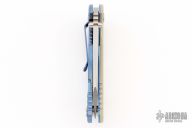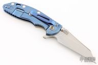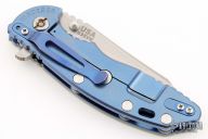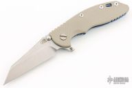 This Fatty XM-18 by Rick Hinderer features a stonewashed wharncliffe blade with notched thumbrest and flipper. The handle has a textured tan G-10 scale, stonewash blue titanium frame and clip, lanyard hole at the butt. Nice detent, lockup and blade seating. Comes with original box and extra hardware. Missing one of the clip screws, otherwise excellent condition.