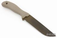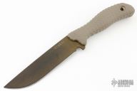 This Mud Mutt by Scrapyard Knives features a drop point bronze coated SR101 blade, .137" blade stock and 1.266" blade depth, hidden tang construction. The handle is tan rubber with lanyard hole. Has some light scuffs, otherwise excellent condition.