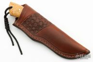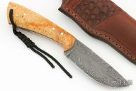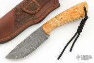 This Hunter by Bill Akers of Backwoods Custom Knives features a Fowler feather pattern Damascus blade with a full tang construction.  .146" Blade Stock.  1.229" Blade Depth.  The handle features burl scales with red liners.  Includes a brown leather sheath. Has some light scuffs, otherwise Excellent Condition.