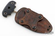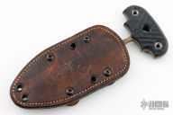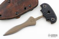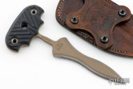 This Reaver Push Dagger by RMJ Tactical features a FDE coated double edged wasp waist blade, .205" blade stock and 1.345" blade depth, full tang construction. The handle has black G-10 scales. Comes with a brown leather sheath with Ulti-Clip made by Chattanooga Leather. Has some minor wear on the blade finish, some patina on the blade edge, otherwise good condition.