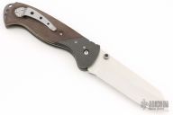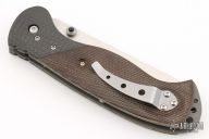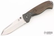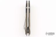 This linerlock folder by Greg Lightfoot features a satin finish recurve blade with an asymmetrical swedge and dual thumbstuds. The handle has carbon fiber bolsters, green canvas micarta scales, bead blasted titanium liners, stainless steel pocket clip, tip up carry. Nice blade seating, detent, and lockup. Comes with a nylon zippered case. Has a couple light scuffs, otherwise excellent condition.