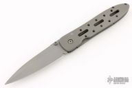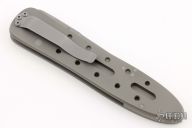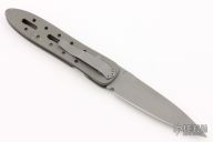 This Assassin linerlock folder by Crawford Knives features a bead blast finished spear point blade with single thumbstud, and a bead blast titanium frame, liner and stainless steel backspacer and tip down clip. Smooth action, nice detent, blade seating and lockup. Has a couple light scuffs, excellent condition otherwise.