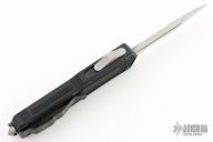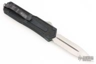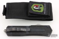 This Scarab OTF auto by Microtech has a satin finished blade with fullers. The handle is black aluminum with blasted fittings, single glass breaker, tip down black stainless steel clip. #0106 and dated 12/2004. Includes original sheath, paperwork, and box. Excellent Condition.