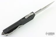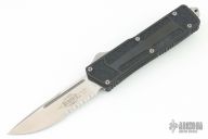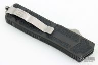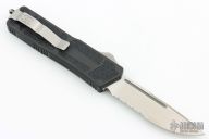 This Scarab OTF auto by Microtech has a satin finished blade with fullers. The handle is black aluminum with blasted fittings, single glass breaker, tip down black stainless steel clip. #0729 and dated 03/2003. Includes original sheath with file and tool, plastic tube, and paperwork. Has a couple light scuffs, otherwise Excellent Condition.