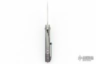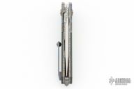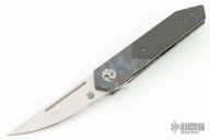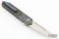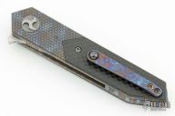 This Kaiken 2 by Glenn Waters, features an upswept hand rub satin finished blade with fullers and flipper, has .150" blade stock. The handle is composed of laser engraved titanium bolsters with carbon fiber scales over flamed titanium liners and backspacer, Timascus tip up pocket clip. There is a ceramic ball inlayed into the pocket clip. Includes padded zippered case. Nice detent, lock up and blade seating. Excellent Condition.