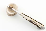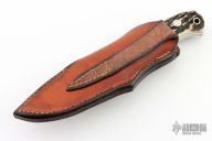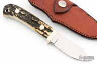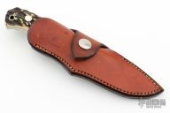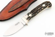 This Skinner by Steve Johnson features a mirror polished blade with notched thumbrest, .187" blade thickness and 1" blade depth, full tapered tang construction. The Bird's Head style handle has a nickel silver guard and stag scales. Comes with a brown leather sheath. Has a couple light scratches on the guard, otherwise excellent condition.