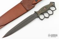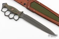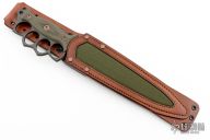 Embodying history and our own design philosophies, Lady Death is our rendition of the classic trench knife. We decided to go big, like no other, with a 15" overall length, and 9 5/8" CPM-Magnacut double-edge dagger blade with a long fuller down the middle. The knuckle duster style handle acts as a guard to protect your hands, and the aggressive outward shape works well for raking. To round out the overall shape, the end of the handle features a pronounced pomel for hammer-striking. The handle is finished with Dirty Olive G10 handle slabs with a checkered texture that is suitable in dry or wet conditions. The handle slabs are attached with Grade 5 Titanium fasteners that are electro-anodized in bronze to round out the look. Lady Death includes a brown leather sheath with a contrasting green canvas inlay. The sheath is ambidextrous, and can be worn on a belt or attached to PALS webbing.