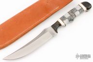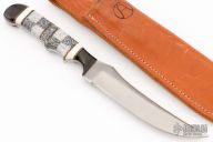 This Hunter by Anza Knives features a blade made from a file, corian scales with a brass spacers and dymondwood bolsters front and rear, .172" blade thickness and 1.155" blade depth, full tang construction. Comes with a brown leather sheath. Excellent condition.