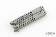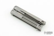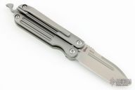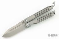 This miniature Balisong by Terrain 365 and Darriel Caston features a drop point blade with a false top edge. The handles are composed of bead blasted titanium. Comes with a zippered case, original box and papers. Excellent condition.